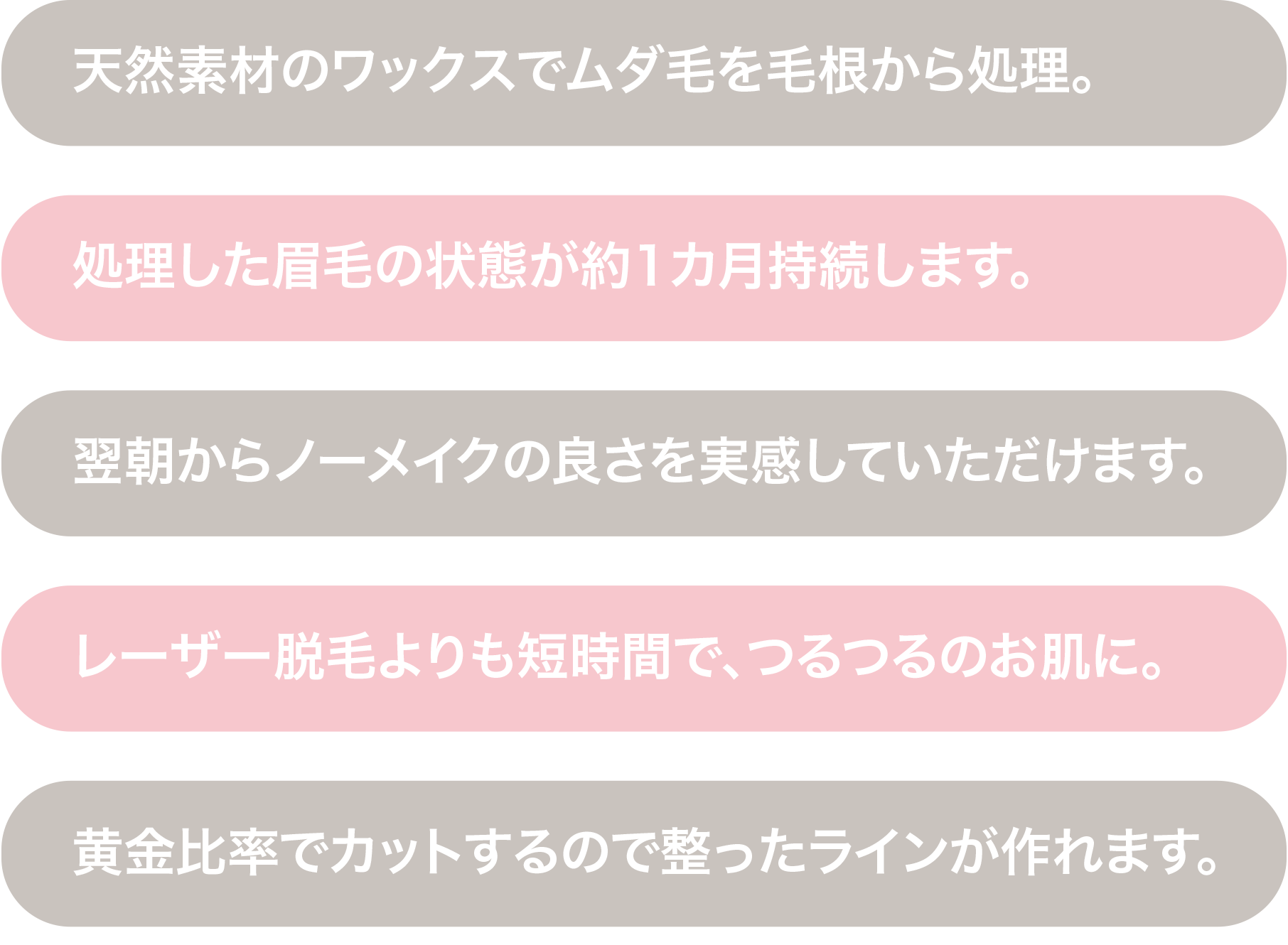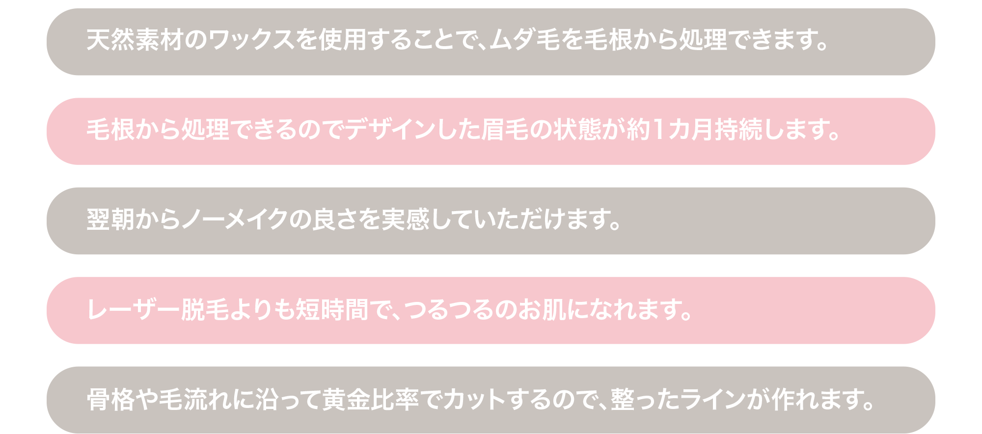 お手入れが意外と難しいのが眉毛です。お顔の黄金比率、骨格に基づいて、顔に立体感のある、自分に似合う眉毛「もっとなりたい顔」に近づけるデザインを提供します。ワックスを用いた施術を行うことで、より最高の美しさを表現します。眉の変化によりお顔全体の印象も変わります。