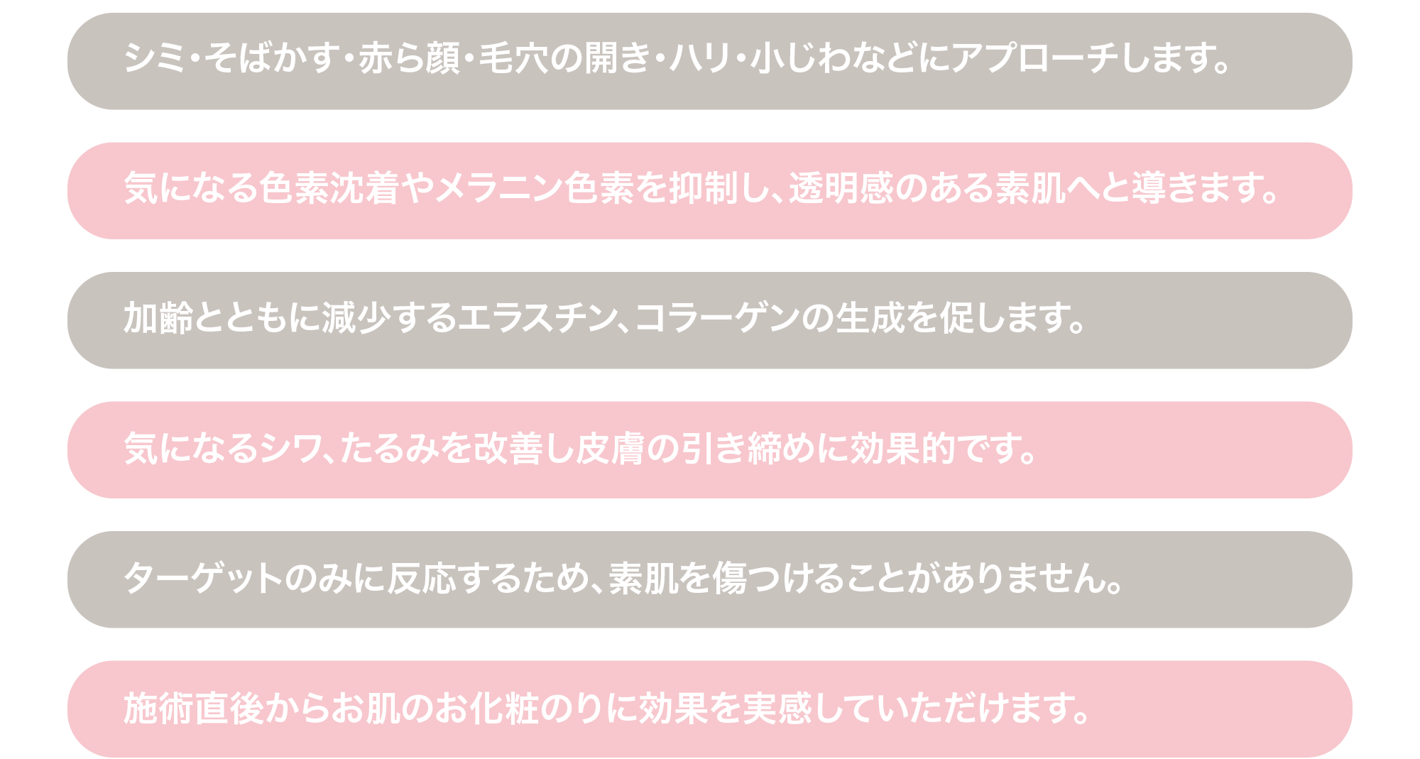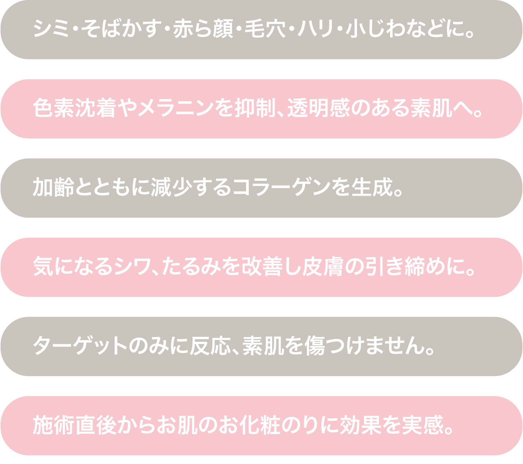 フェイシャルの光が肌トラブルの原因を改善。同時に、コラーゲンを増生することで、お肌の質感を整え、ハリのある肌を保ちます。気になるエイジングポイント(小じわ・シミ・そばかす・赤ら顔・くすみ・クマ・毛穴・弾力)に働きかけながら、色素沈着を軽減。お肌を活性化し美白美肌効果でワントーン明るい透き通ったハリのあるお肌へと導きます。